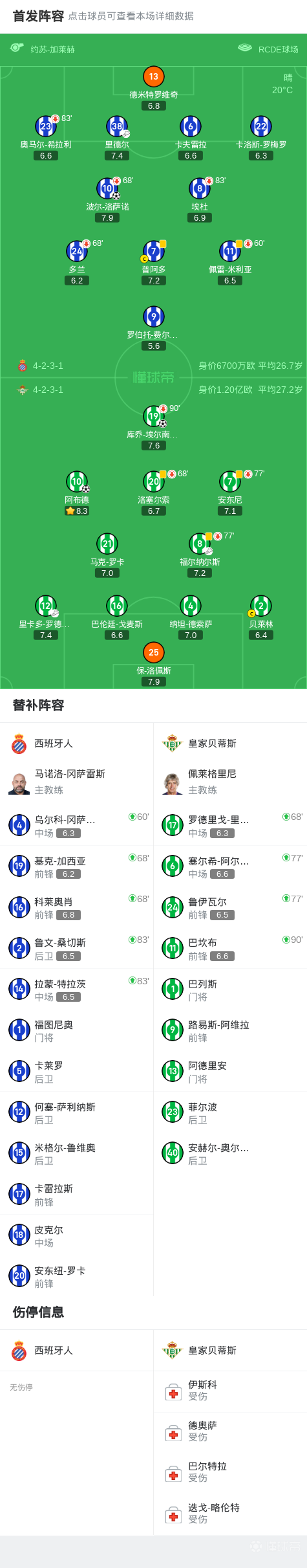 第54分钟,里卡多-罗德里格斯弧线传中,库乔头槌建功,贝蒂斯1-1追平西班牙人